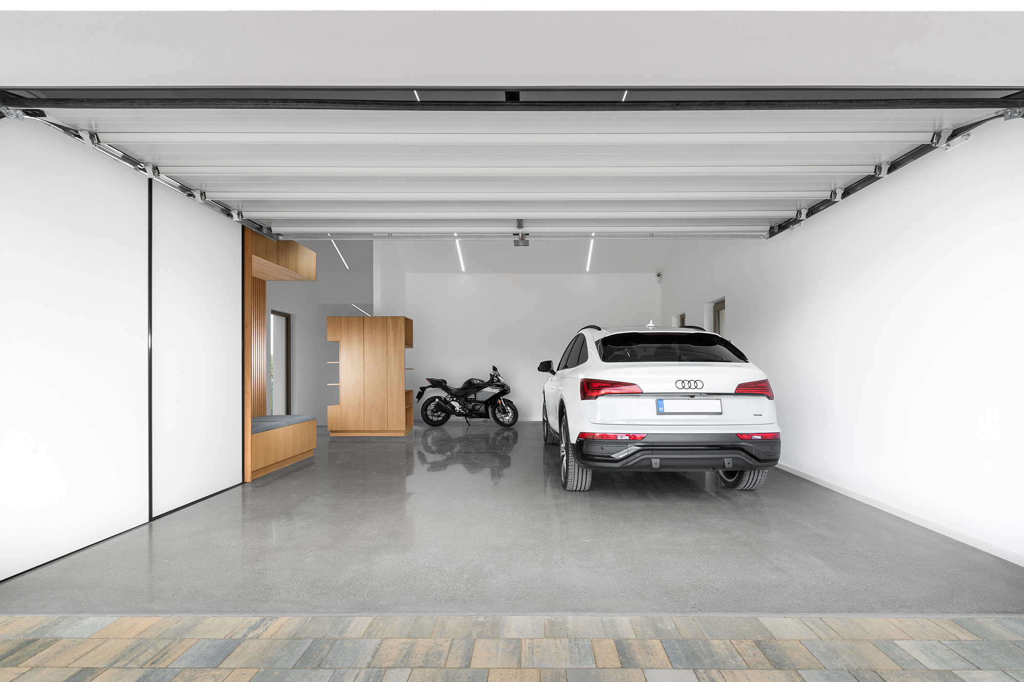 Polierter Beton, großzügiger Raum für zwei Autos und Freizeit-Fahrzeuge. Mit geschmackvollem, gepolstertem Vorraum und separatem Waschraum. Das Heimkommen beginnt hier — mit einem Komfort, der sich vollkommen natürlich anfühlt.