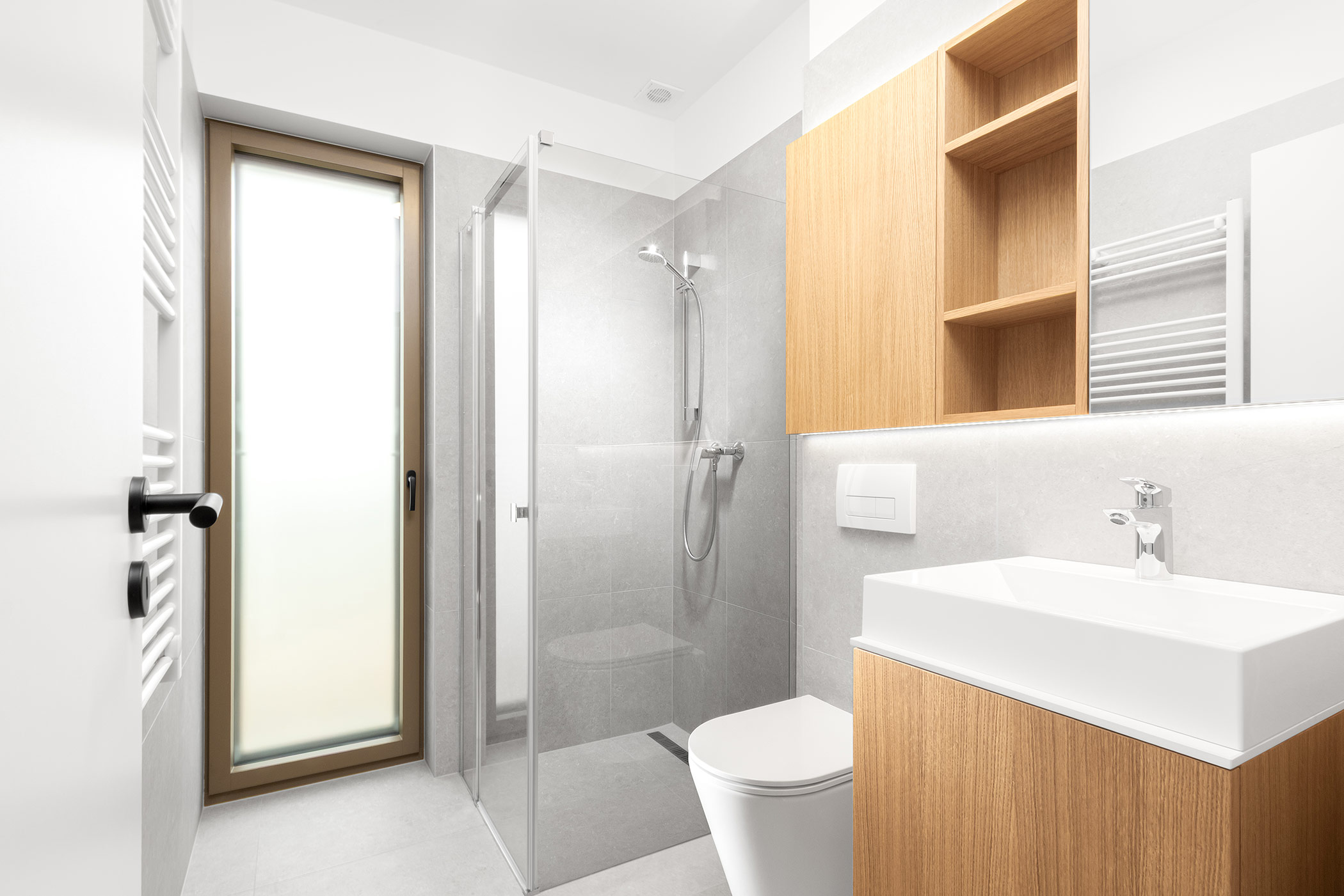 Das Badezimmer des Apartments verbindet auf harmonische Weise moderne Eleganz mit Komfort. In dem großzügigen, von natürlichem Licht durchfluteten Raum bildet eine puristische Duschzone mit teilweise gläserner Wand das Herzstück. Hochwertige Fliesen, sorgfältig ausgewählte Farben und dezente, aber charaktervolle Details schaffen eine ruhige, kompromisslose Wohlfühlatmosphäre, die jedes Mal an ein Boutique-Spa erinnert.