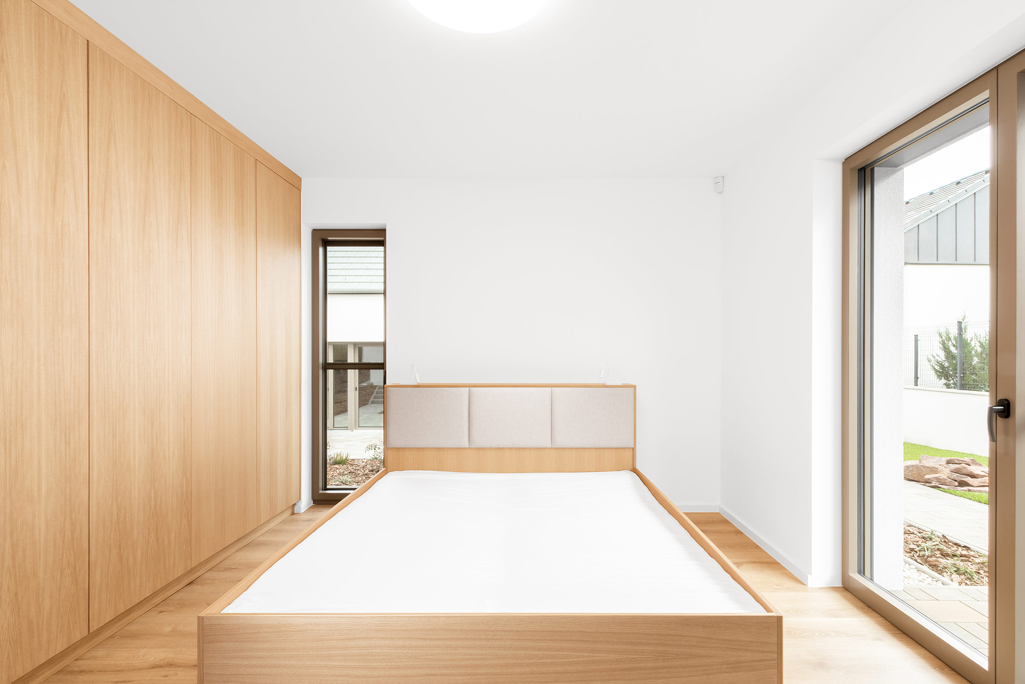 Zwei separate Baukörper trennen geschickt die funktionalen Bereiche (Garage, Abstellraum, Waschküche und Gästeapartment) vom privaten Wohnbereich der Familie (zwei Schlafzimmer, Wohnzimmer, Küche, Vorratsraum, Bad). Dazwischen liegt ein atmosphärischer Innenhof, der als Rückzugsort vor neugierigen Blicken dient. Durch großzügige, natürlich wirkende Holzfenster öffnet sich vom Wohnzimmer die Terrasse und macht den Garten zu einem organischen Teil des Hauses.