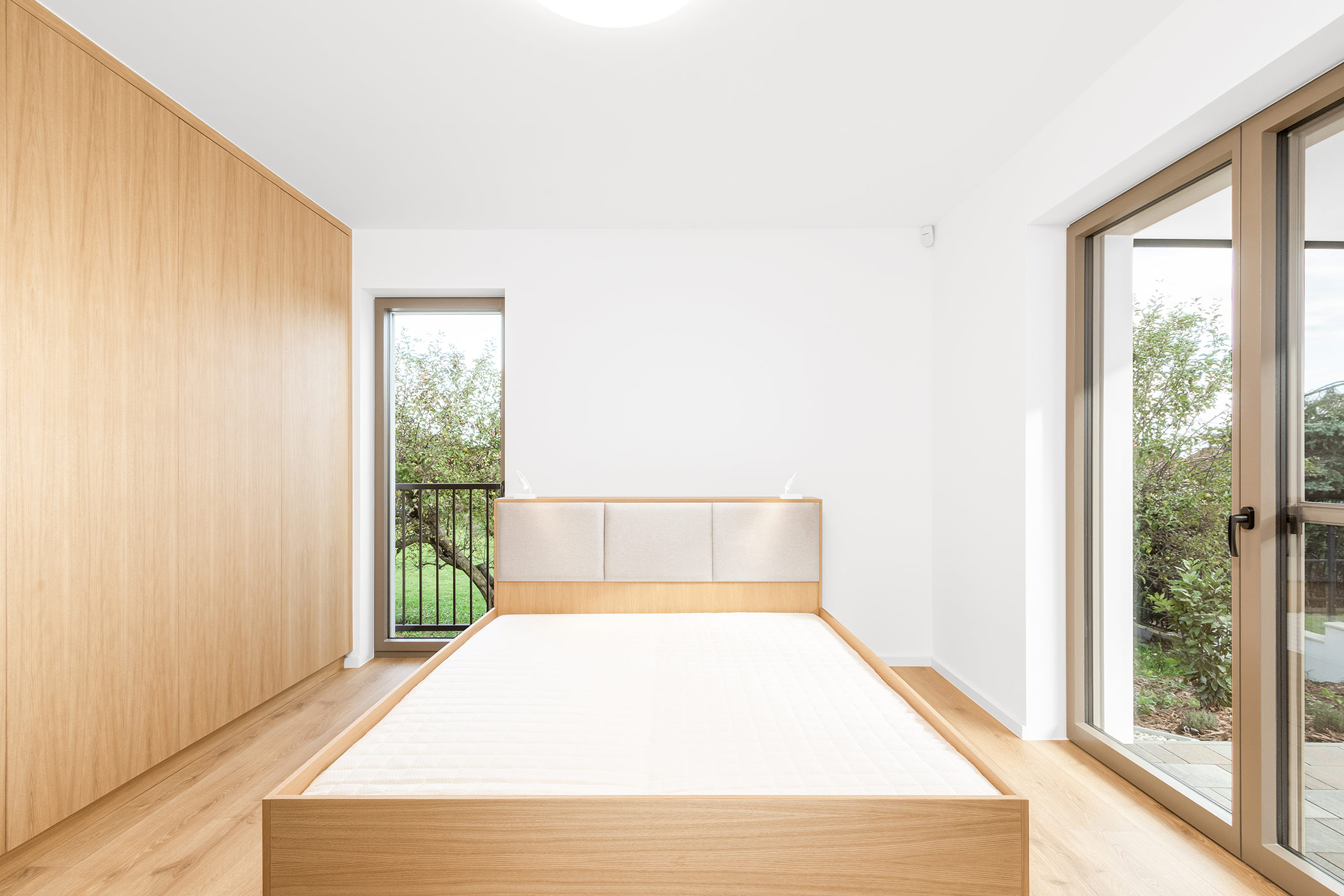 Aus Gründen von Lebenspraktikabilität und Überlegung schützt das Haupthaus die Privatsphäre seines Bewohners auf angemessene Weise. Eine Schlafzimmerzone mit zwei Räumen, Bad und einer zweiten Waschküche kann durch Schiebetüren abgetrennt werden. Ein ruhiger, intimer Raum, in dem Erholung nicht bloß eine Option, sondern garantiert ist.